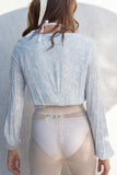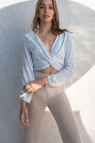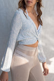 Indulge in the ultimate beach-ready top with the Clarissa Twist Front Top. The lightweight gauze material offers ultimate comfort while the knot detail and plunge neckline add a touch of style. With long sleeves and a relaxed fit, this crop top is perfect for any beach day.