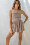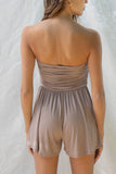 The Liz Shirring Romper features a strapless design with a shirred bodice and an elastic waistband for a comfortable, tailored fit. Crafted with stretch fabric, it offers ease of movement while maintaining a sleek silhouette. Front pockets add a practical yet refined touch to this sophisticated piece.